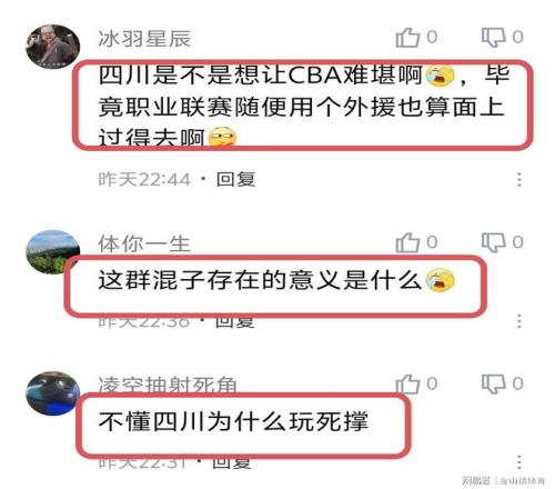 “真就不能考慮考慮升降級嗎?寧波都改頭換面了,四川和江蘇還是這死樣。”;“職業球員20中1,是怎么做到的?”;“十分鐘比賽拿八分,就這是國內球員的水平。”;“四川隊是不是想讓CBA難堪啊,畢竟職業聯賽隨便用個外援也算面上過得去啊!”;“這群混子存在的意義是什么”;“這群混子存在的意義是什么?”……