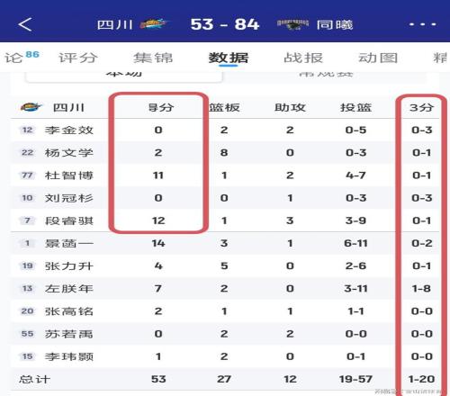 賽后的技術統計,真的不忍卒讀。四川隊全場總共得53分,去掉罰球的14分,實際上動動戰只得了39分。全隊除了景菡一和段睿騏得分上雙,首發李金效0分,劉冠杉0分,楊文學2分。全隊總共只有12次助攻,籃板球輸了同曦幾20個,失誤14次。更令人尷尬的是,全隊有8名球員在三分線上出手20次,僅命中一球,命中率為5%。